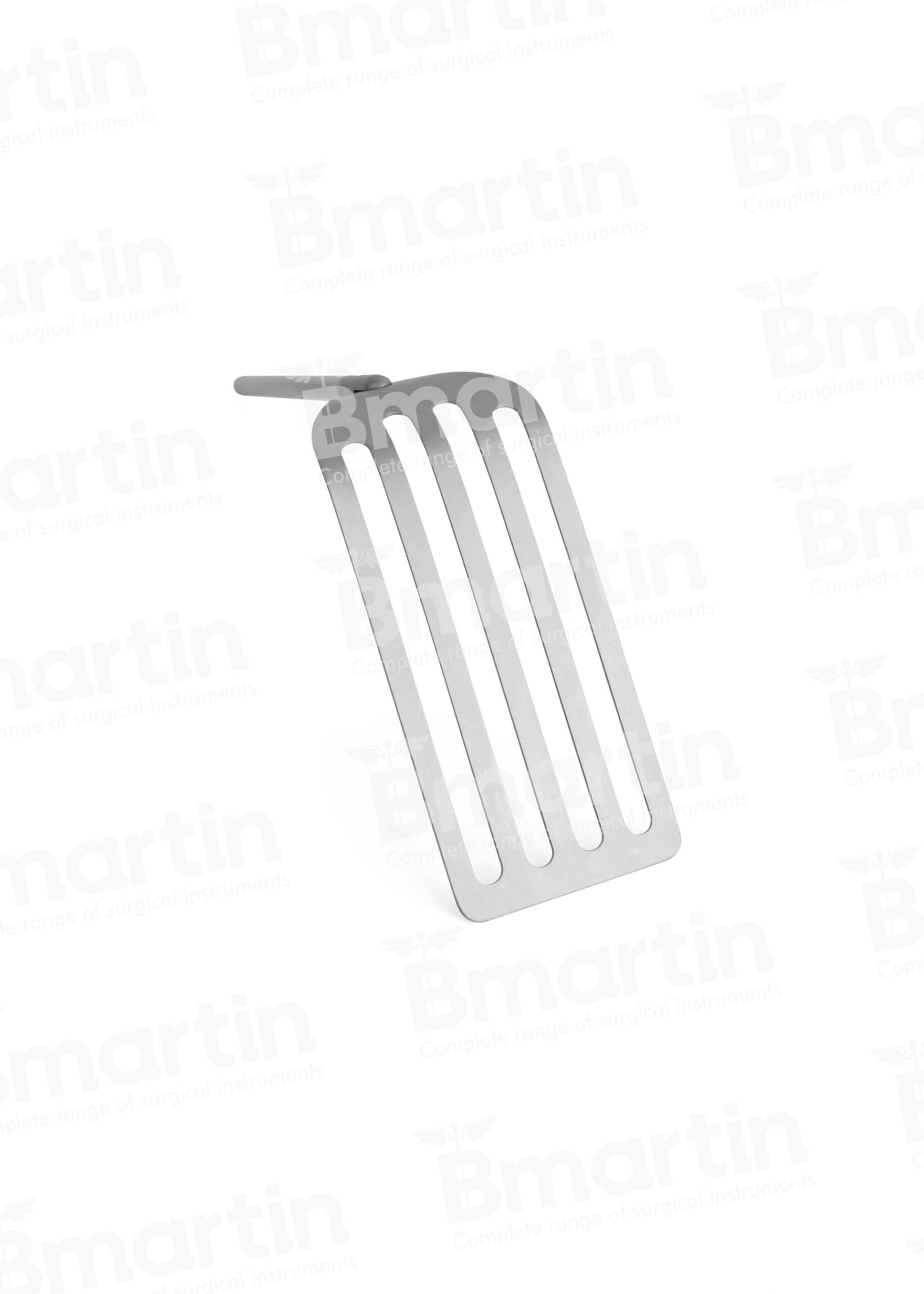 The malleable slotted retractor blade can be bent to conform precisely to the contours of the wound and underlying organs, making it highly adaptable to irregular or curved incision profiles. The longitudinal slots reduce the overall surface area in contact with tissue and allow wound fluids and irrigation to drain freely, reducing pooling and improving visibility in the operative field. B Martin Omni Track malleable slotted blades (BMO-141 and BMO-142) are available in 2″ x 6½” and 3″ x 6½” widths. They retain their set shape during use and can be reshaped as needed. Compatible with the BES-110 blade joint system and manufactured from malleable surgical stainless steel.